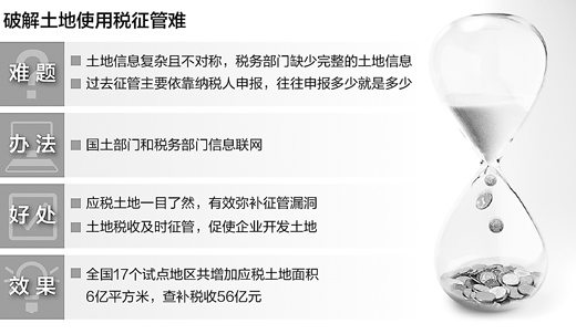土地使用税征管一直是我国当前税收领域的难题之一,因为土地权属、时间、面积等方面的信息复杂,少数企业利用信息不对称逃避纳税义务,也给一些房地产企业囤积土地创造了便利。为此,国家税务总局与国土资源部联合开展了“以地控税、以税节地”试点工作,通过信息共享解决监管缺失的问题。这一措施能否从根本上堵住税收征管漏洞,并促进土地集约利用?记者近日来到最先开展试点的山东省进行了调研。