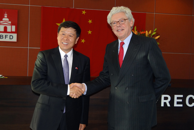 图为 王军与荷兰财政文献局监事会主席史泰夫·维侯亲切握手
