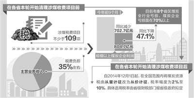 长期以来,我国煤炭税费种类繁多、税收和行政性收费项目叠加,给煤炭行业带来沉重负担。据中国煤炭工业协会副秘书长张宏介绍,在各省份本轮开始清理涉煤收费项目以前,我国涉煤的各类税费项目不少于109项,税费负担水平约占煤炭企业主营业务收入的35%左右。