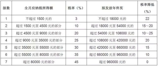 附表(以工资、薪金为例):拟发放年终奖及税率降低一览表