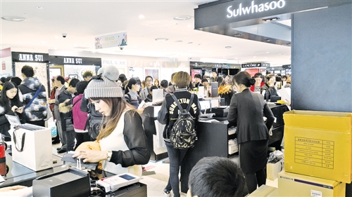 “雪花秀”品牌作为爱茉莉太平洋旗下的高档化妆品品牌在中国游客中颇具人气。图为乐天免税店首尔小公洞店“雪花秀”专柜,等待购物的顾客排起了20米长队,其中绝大多数都是中国游客。本报驻首尔记者 杨 明摄
