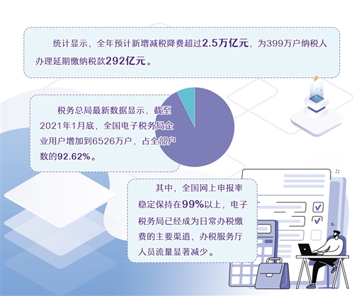 “办好惠民实事”如何体现?减税降费关系市场主体纾困解难,广大企业特别是中小微企业期待着政策红利进一步释放。确保优惠政策直达快享,正是“春风行动”的一项重要内容。2020年,在疫情发生后,国家出台一系列有针对性的减税降费政策,企业需要政策落实快、落实准、落实细。税务总局明确提出“优惠政策落实要给力”,以最快速度、最高效率确保政策红利直达市场主体。统计显示,全年预计新增减税降费超过2.5万亿元,为399万户纳税人办理延期缴纳税款292亿元。